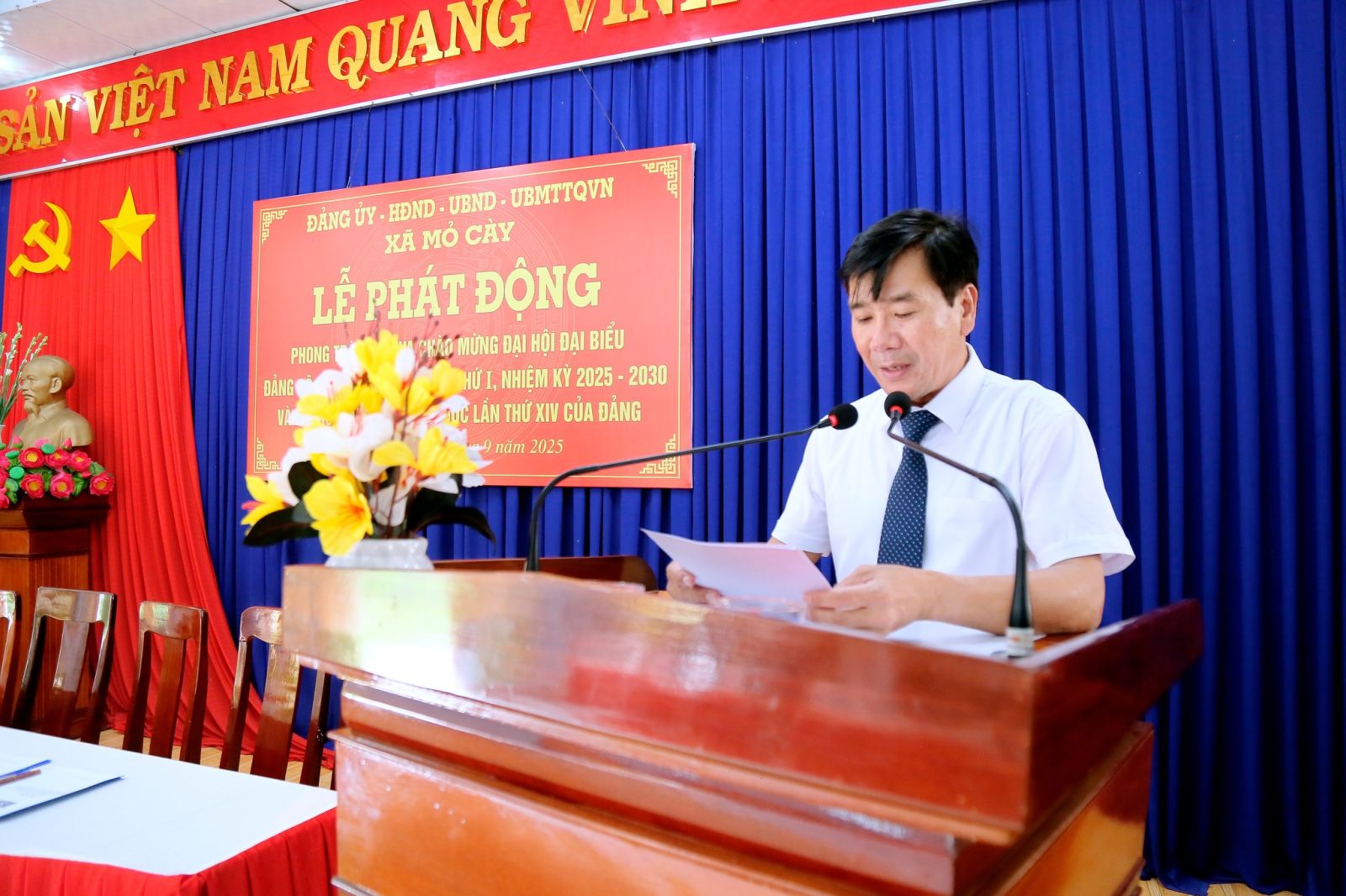 Với chủ đề “Đảng bộ, quân và dân xã Mỏ Cày quyết tâm vững bước tiến lên, hiện thực hóa khát vọng phát triển, phấn đấu đến năm 2030 xã Mỏ Cày đạt chuẩn xã nông thôn mới nâng cao”, Bí thư Đảng ủy, Chủ tịch HĐND xã Võ Lâm kêu gọi các cơ quan, đơn vị tích cực hưởng ứng phong trào thi đua, nêu cao tinh thần trách nhiệm, thống nhất hành động, quyết tâm thực hiện khẩu hiệu “Chung sức đồng lòng, thi đua hoàn thành thắng lợi Nghị quyết Đại hội đại biểu Đảng bộ xã Mỏ Cày lần thứ I, nhiệm kỳ 2025 - 2030”. Đồng chí đề nghị các cấp ủy, cơ quan, đơn vị xây dựng kế hoạch, nội dung và biện pháp cụ thể, tập trung triển khai 5 nhiệm vụ trọng tâm gồm: Tiếp tục xây dựng, chỉnh đốn Đảng trong sạch, vững mạnh toàn diện; Phát triển nông nghiệp toàn diện gắn với xây dựng nông thôn mới; Tăng cường quản lý, bảo tồn và phát huy giá trị các di tích lịch sử và đẩy mạnh phát triển du lịch biển, du lịch nông nghiệp; Tiếp tục đẩy mạnh cải cách hành chính; Xây dựng nền quốc phòng toàn dân gắn với thế trận an ninh nhân dân. 3 nhiệm vụ đột phá gồm: Đầu tư phát triển kết cấu hạ tầng đồng bộ, hiện đại; Nâng cao chất lượng nguồn nhân lực; Tập trung thực hiện cải cách hành chính toàn diện, đẩy mạnh ứng dụng khoa học, công nghệ, thúc đẩy đổi mới sáng tạo, chuyển đổi số.