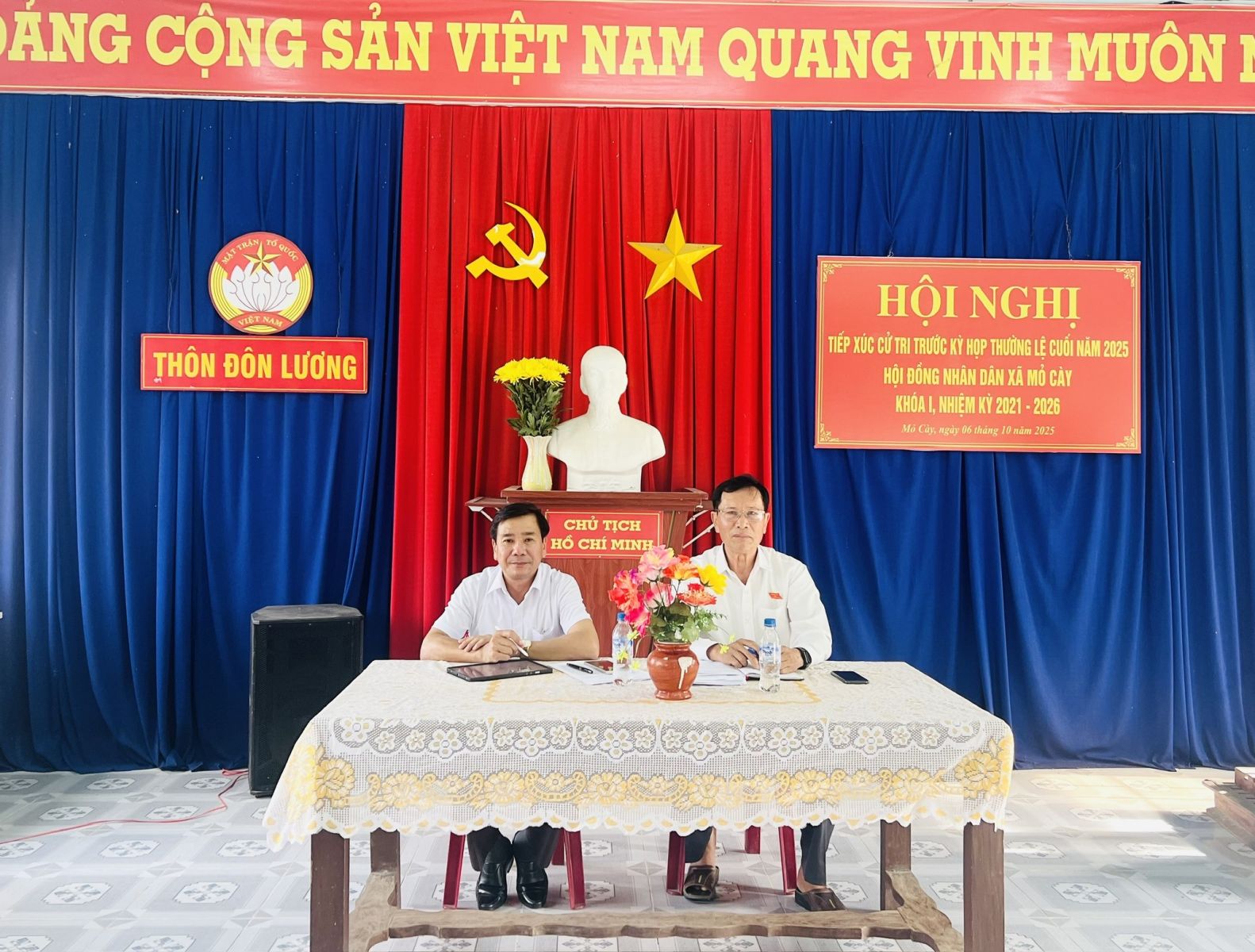 Để chuẩn bị cho kỳ họp thường lệ cuối năm 2025 của đại biểu HĐND xã Mỏ Cày khóa I, nhiệm kỳ 2021- 2026, chiều ngày 06/10/2025, Tổ đại biểu HĐND xã Mỏ Cày được bầu tại các thôn Đôn Lương và Lương Nông Nam đã có buổi tiếp xúc với cử tri tại nhà văn hóa của 02 thôn.