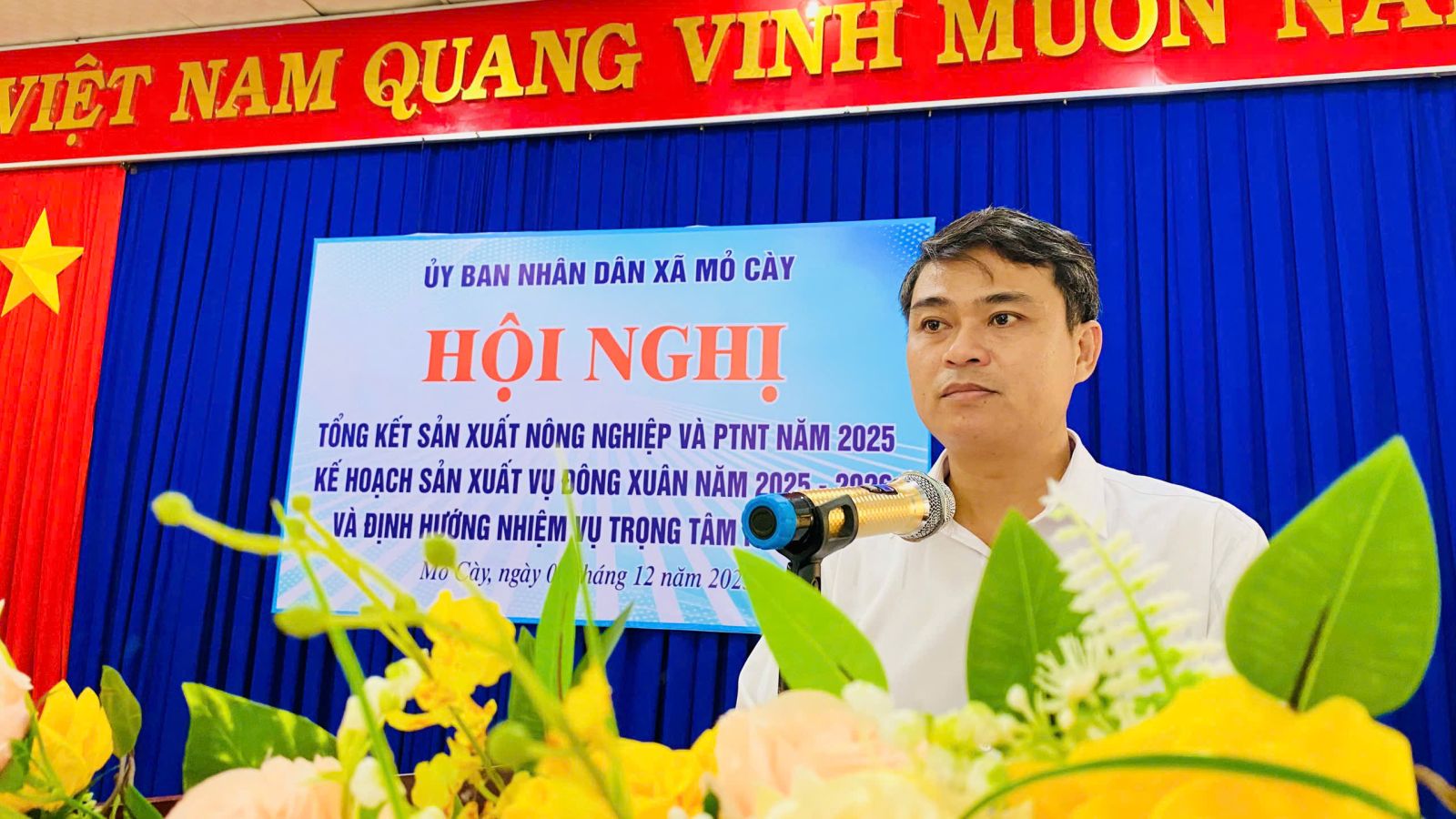Cũng tại hội nghị, UBND xã Mỏ Cày đã triển khai kế hoạch sản xuất nông nghiệp năm 2026 và biện pháp sản xuất vụ Đông Xuân 2025-2026. Theo kế hoạch, vụ sản xuất Đông Xuân 2025-2026, sẽ tiến hành gieo sạ đại trà từ 25/12/2025 đến trước ngày 05/01/2026, thu hoạch trước 20/4/2026. Về cơ cấu giống trong vụ Đông Xuân 2025-2026, theo chỉ đạo xã Mỏ Cày sẽ đưa vào vụ sản xuất Đông Xuân năm nay những giống lúa chất lượng, năng suất cao với thời gian sinh trưởng trung và ngắn ngày như: Bắc Thịnh, Thiên ưu 8, Thiên Hương 6, Hà Phát 3, DT45, Đài thơm 8, QNg13, ML232, MT10….