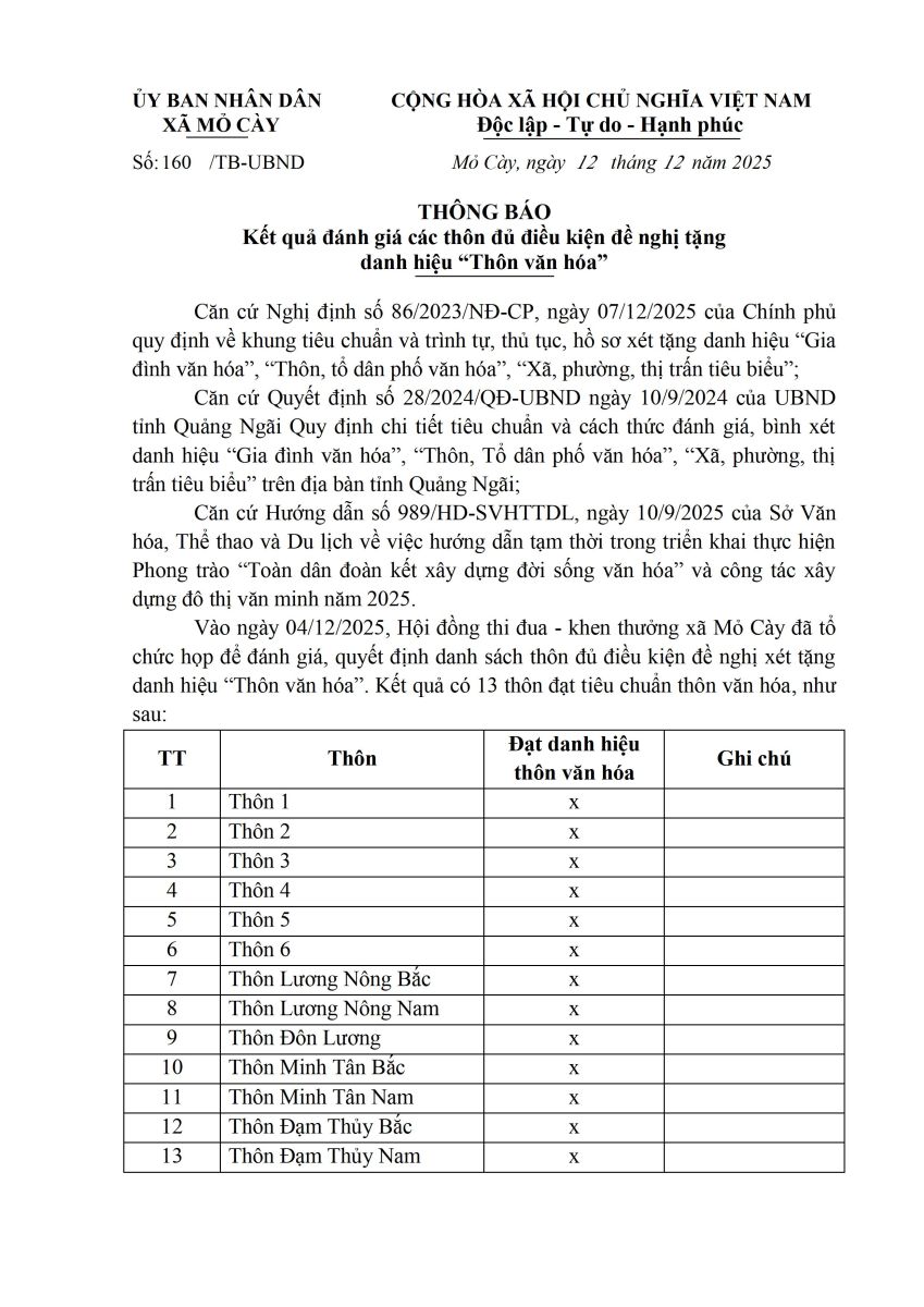 Thứ sáu, 12/12/2025 | 14:56 A- A A+ | Thông báo kết quả đánh giá các thôn đủ điều kiện tặng danh hiệu "Thôn văn hóa" Giọng nữ miền Bắc Giọng nam miền Bắc Giọng nữ miền Nam Đọc bài Chia sẻ Lưu